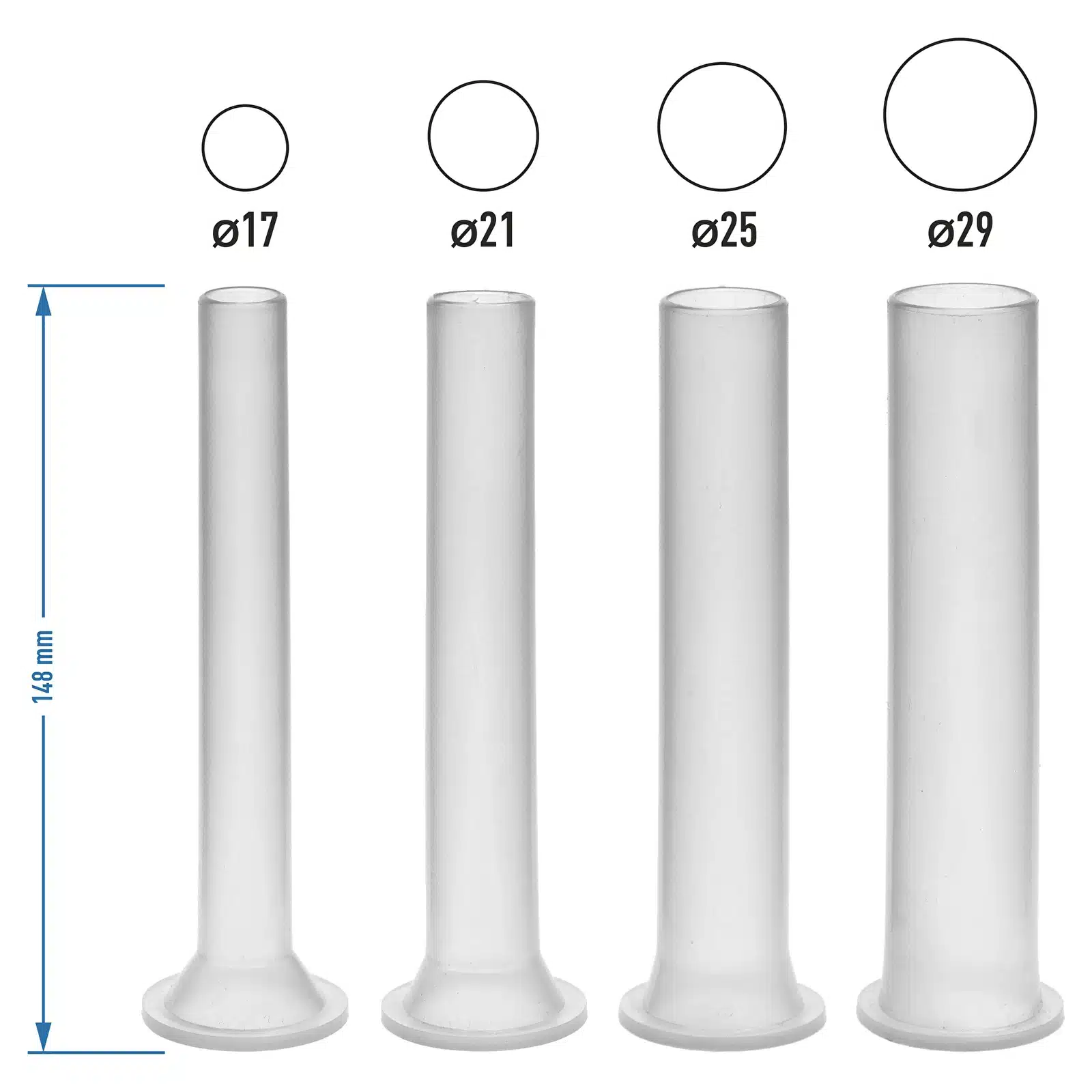 Valmistatud roostevabast terasest ja varustatud kiire ja lihtsasti kasutatava täitmissüsteemiga. Komplekt sisaldab nelja erineva suurusega lehtrit – läbimõõdud: 15, 19, 22 ja 25 mm.