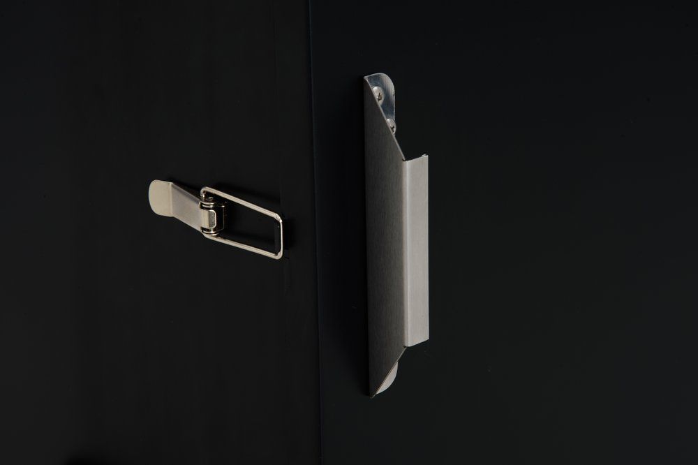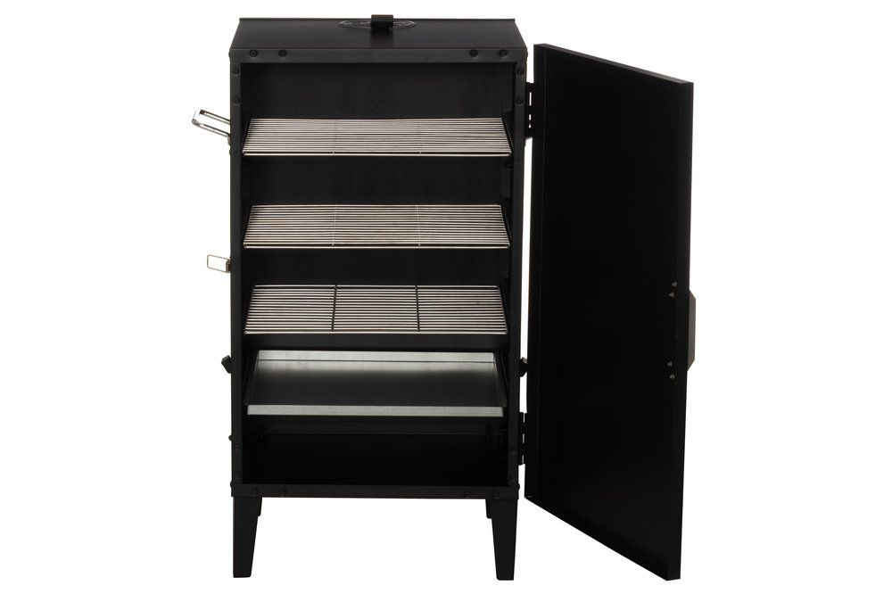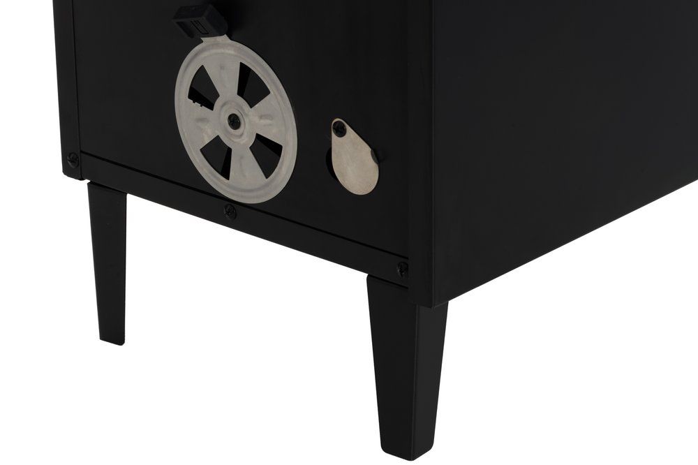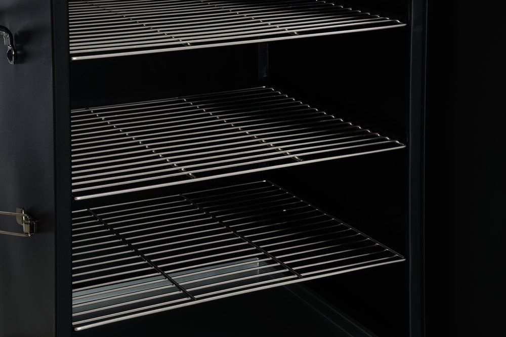 Külmsuitsutamise kapp. 3 roostevabast terasest resti mõõtmetega 37 x 32 cm. Õhuklapid niiskuse eemaldamiseks kapist.